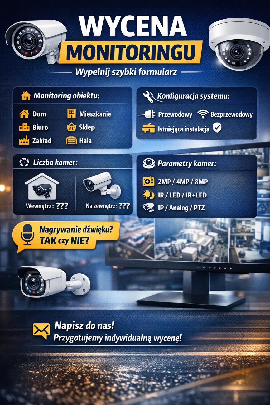 Monitoring jest nowoczesnym, sprawdzonym i najtańszym sposobem ochrony posiadanego mienia. Pozwala skutecznie zabezpieczyć cały obiekt lub dowolnie wskazane pomieszczenie. Polega na podłączeniu zainstalowanego w budynku systemu alarmowego z niezależnym od niego Centrum Monitoringu. W Centrum prowadzona jest ciągła i aktywna obserwacja stanu elektronicznych zabezpieczeń zainstalowanych w chronionym obiekcie. Odbierany i zapisywany jest każdy sygnał, sygnały o napadzie, kradzieży, włamaniu, lub jakiejkolwiek próbie uszkodzenia systemu alarmowego są natychmiast sprawdzane. Prawidłowo skonstruowany system monitoringu pozwala również na wyeliminowaniu luk w zabezpieczeniach podczas ochrony imprez masowych na dużym, otwartym terenie.